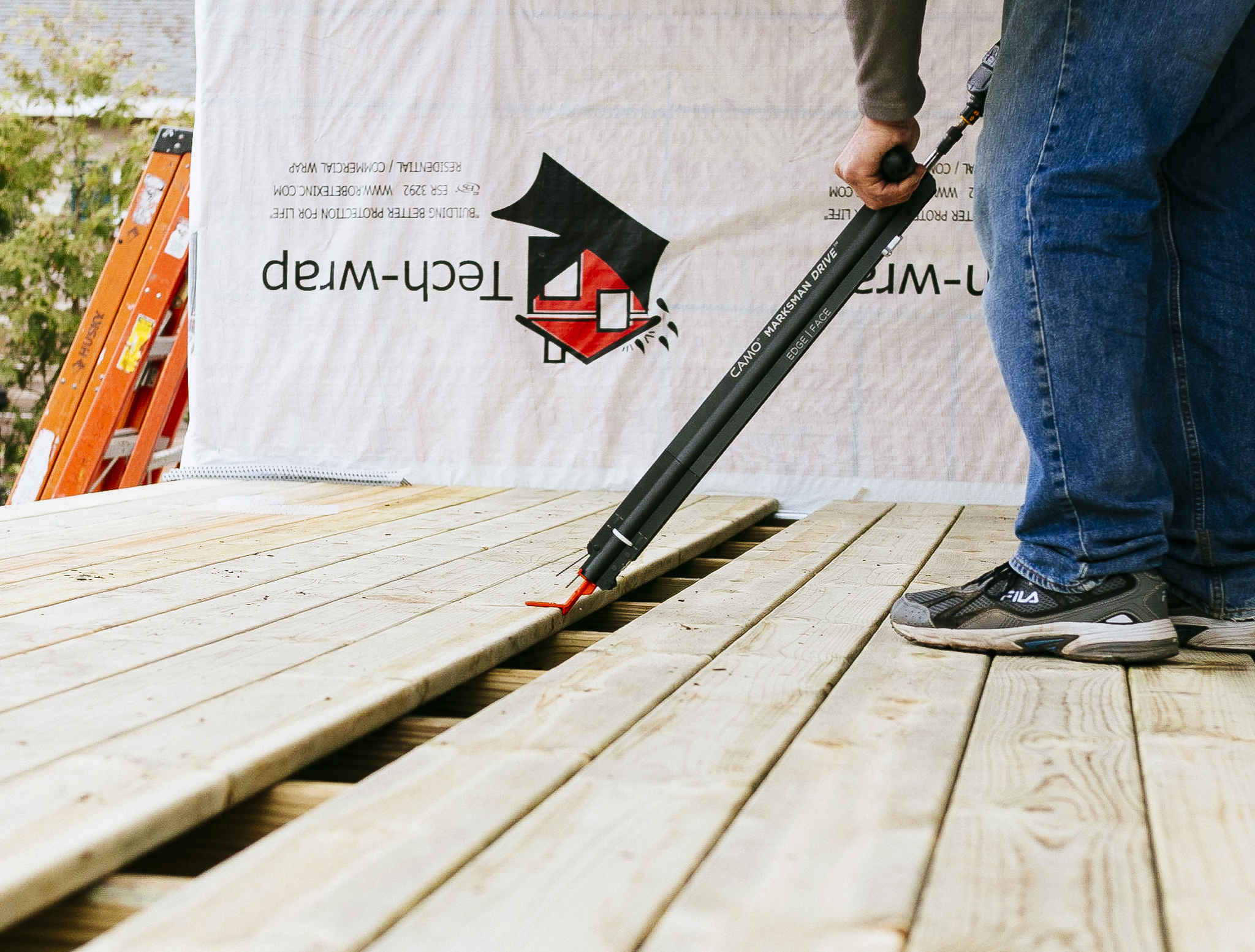 Usar uma TÁBUA tratada com pressão tradicional não significa que você tem que prendê-la da maneira tradicional. Enquanto é feita a fixação da face, as tábuas provavelmente se dividirão e racharão com o tempo. Atinja uma superfície livre de fixadores usando ferramentas CAMO e parafusos de deck Edge para fixar as tábuas através de sua borda. Se você deseja um deck com a tradicional face fixa, use os parafusos CAMO de Madeira agrupados ou os parafusos de deck Premium.