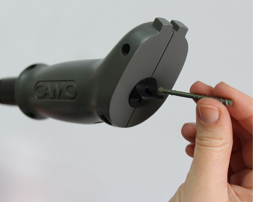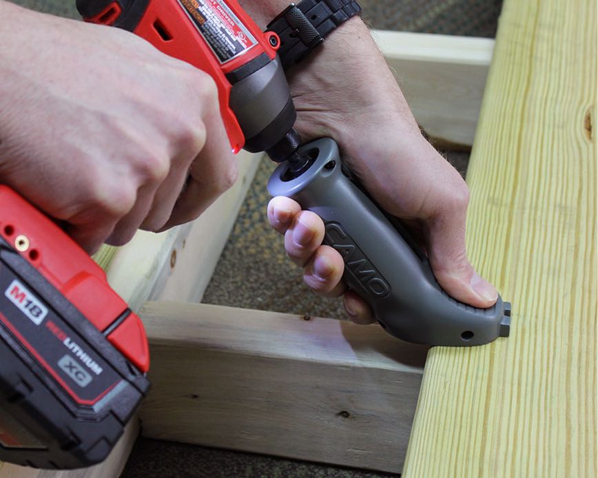 - Ferramenta de disparo único, sem folga, instala um parafuso CAMO Edge deck através da borda da tábua