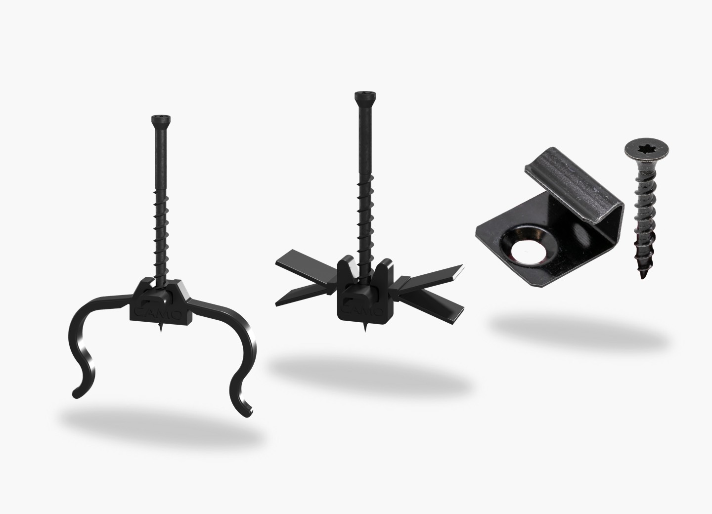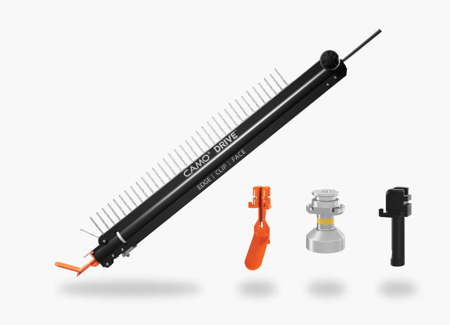 Os clipes do deck CAMO facilitam a instalação de decks ranhurados para todos. Prenda-os manualmente com o Guia Never-Miss ou em pé com o DRIVE.